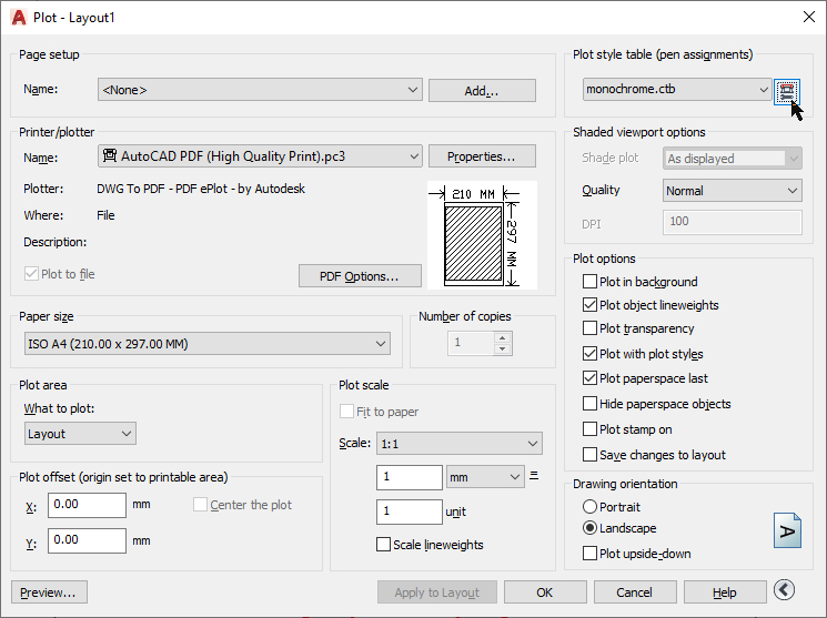 A nyomtatási panelen válasszuk a monochrome tollkiosztást, és a programmal kapott AutoCAD PDF "nyomtatót".