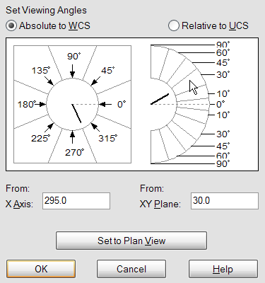3D nézetek beállítására használható például a Nézet • 3D nézetek • Nézőpont beállítása (View • 3D Views • Viewpoint Presets) menüpont (= dpNézőpont (ddVPoint) parancs). Ennek párbeszédpanelén megadhatjuk a nézet irányának az alap-síkban, ill. attól mért szögét. E megadás történhet a szögek megfelelő rovatba írásával, vagy a megfelelő területre való kattintással.