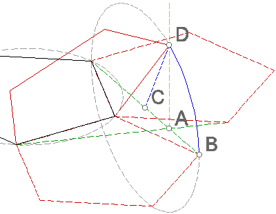 A létrejött (szaggatott piros) elemek fölfoghatók a dodekaéder síkba kiterített oldalainak. Ha vissza akarjuk őket „hajtogatni” térbelivé, nyilván az előbb tükrözésre használt közös él körül forognak, csúcsaik pedig olyan köríveken mozognak, melyek fölülnézete az A ponton átmenő két (szaggatott zöld) egyenes, és akkor érik el végső helyüket, ha (az A pont felett) találkoznak.