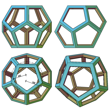 A négy további alsó oldallap kiosztható (Array), a létrejövő fél-dodekaéder tükrözhető (Tükröz3d (Mirror3d)) a ferde lapok fölső éleinek felezőpontjai által megadott vízszintes síkra, végül valamelyik fél-dodekaédert elforgatható (Rotate) 180°kal (ill. 36+n×72°-kal).