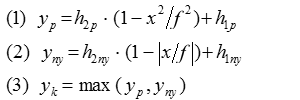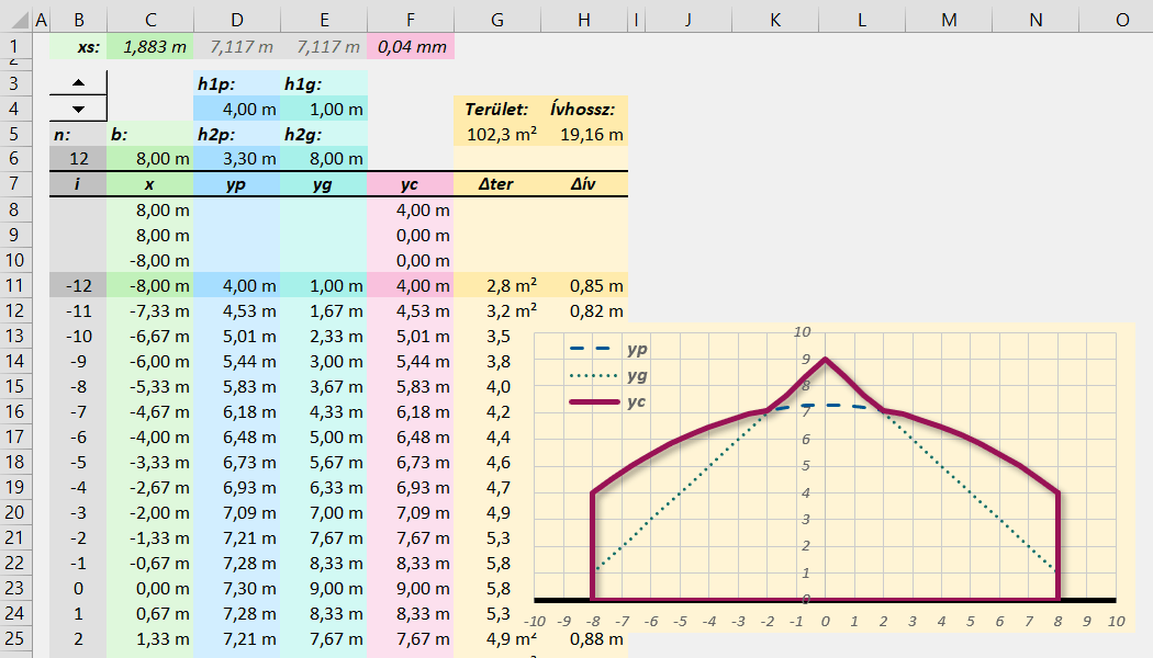 Az f fél fesztávolságot kiindulásul adott n számú egyenlő részre osztjuk (n=10). A görbe felrajzolása úgy történik, hogy x irányban végighaladunk -f-től +f-ig a teljes fesztávolság mentén, és az f/n egységeknél kiszámítjuk az yp parabola, és yny nyeregtető magassági koordinátákat. A keresett felső kontúrgörbe magassági koordinátáját úgy kapjuk, hogy az azonos x értékhez tartozó yp és yny magassági koordináták közül mindig a nagyobbat vesszük.