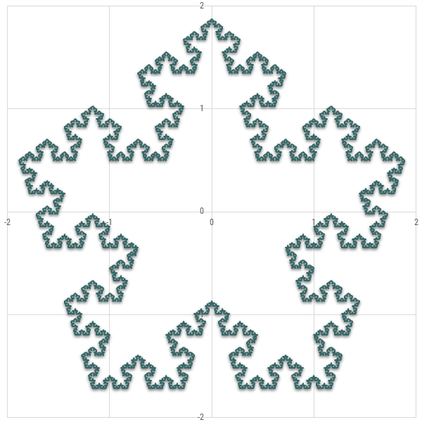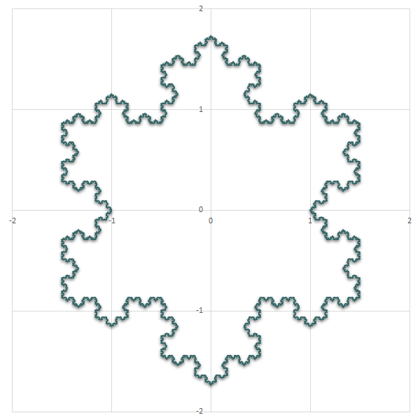 Az illusztráción szereplő alakzat a Koch hópehely, az egyik legelső és talán legismertebb olyan fraktál, mely egyértelmű helyettesítési szabályok alapján, rekurzív módon generálható.