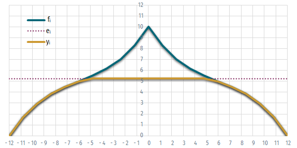 The accuracy of the representaiton of the curve is determined by the number of points in which the value of the function is calculated. Since in this case the function is symmetrical, it is worth dividing it into an even number of sections (2n). We can use a variable traditionally denoted by i for indicating the sequence number of each point from –n to +n (-10 ≤ i ≤ +10). The x coordinate of the point i is then obtained by the formula i/n*b.
