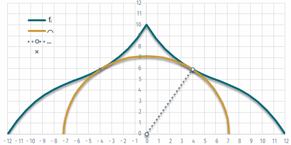 If we increase the radius of the semicircle it obviously reaches the point of the function that is closest to its center point, the origin. The distance of this point of contact from the origin decides the radius of the semicircle. As a first approximation, we can look for the closest point that has been used in the representation of the function — later we will look for a more precise solution.
